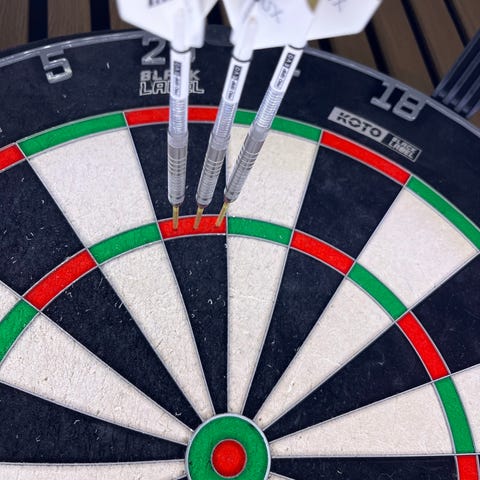 Darttavla med tillhörande pilar i plast. Tavlan är rund med svart och gul design och har markerade poängzoner. Pilarna är röda med plastspetsar.