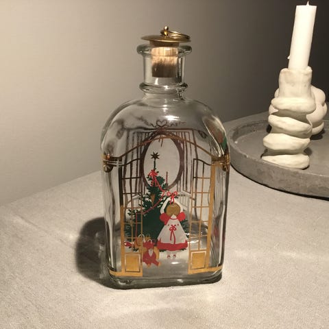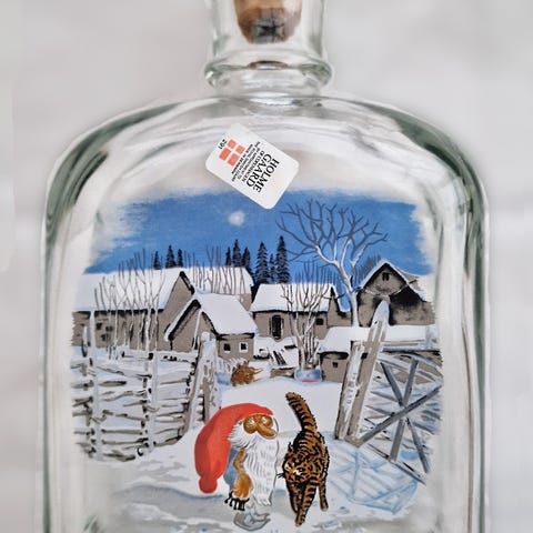 Snapskaraff med målade julmotiv på alla 4 sidorna från Holmegaard. Inte ny men oanvänd, rymmer 75 cl. Nypris 599 kr. Hämtas, skickas ej.