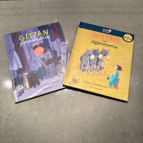 Tre barnböcker: "Kenla bakar bullar" av Inga Lindgren, "Gittan, en sambo för sig" och "Vilda Billen får en hund". Böckerna är illustrerade och riktar sig till barn.