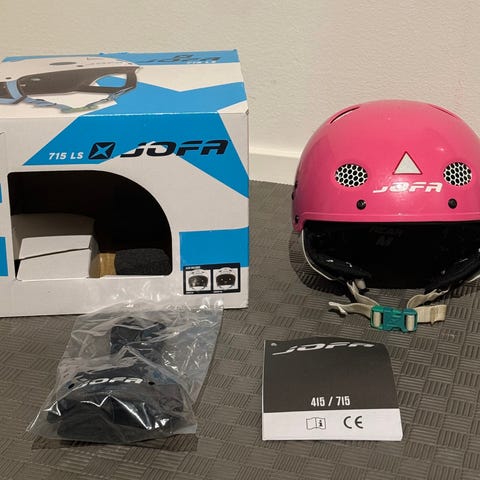 Jofa hjälm i rosa färg med ventilationshål och justerbart hakband.