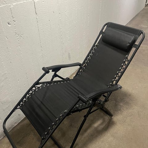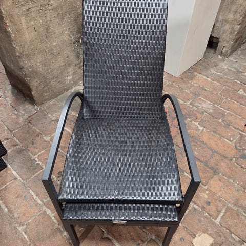 Solstol i svart metall med justerbar ryggstöd och armstöd. Designad för utomhusbruk med en robust och hållbar konstruktion. 1000kr/st finns 4st