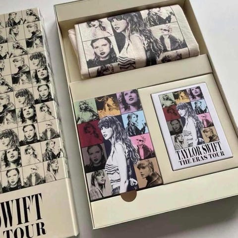 En helt ny oanvänd och oöppnad Taylor Swift Eras Tour VIP-paket Merch Box från 2024, Sverige. Officiella VIP Merchandise-lådan.