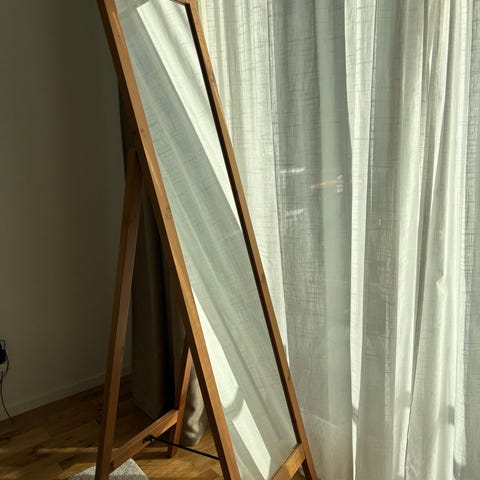 IKEA spegel med ram, ask. Spegeln är fristående med en höjd på cirka 165,9 cm och en bredd på cirka 52,5 cm. Den har en djup ram och en stabil konstruktion som gör den lämplig för användning i hemmet.