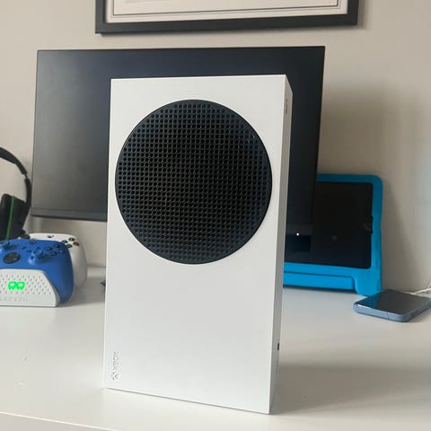 Xbox One S (vit) spelkonsol med två handkontroller. Inkluderar 12 spel i olika genrer, bland annat äventyr och action.