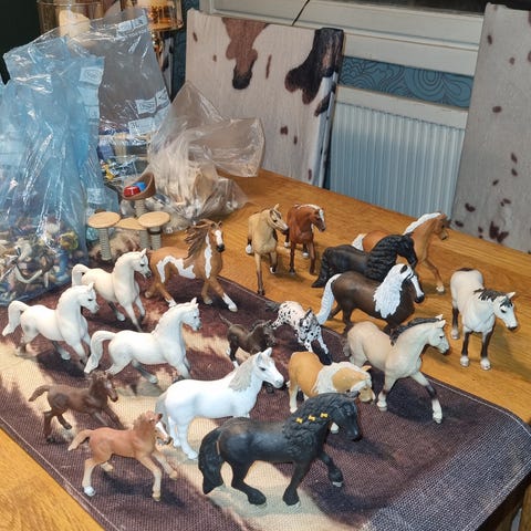 Bild 2 och 3: Schleich hästar 6 st, ryttare, sadel mm