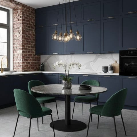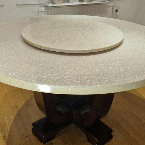 Elegant runt bord med äkta ljus marmorskiva och stabil svart metallfot. Ger rummet ett exklusivt, tidlöst uttryck.