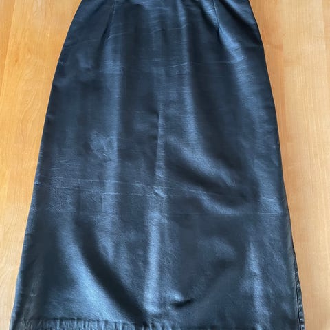 Ny oanvänd läderkjol med märk- och prislappar kvar, 549 kr. Storleken är small enligt etiketten i kjolen men den verkar större, midja c:a 75 cm, 64 cm lång och har motveck bak (täckt sprund). Hämtas, skickas ej.