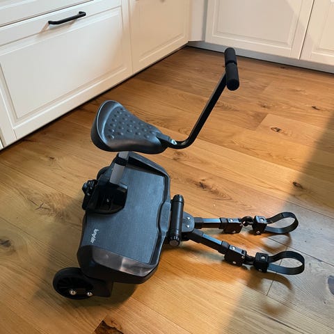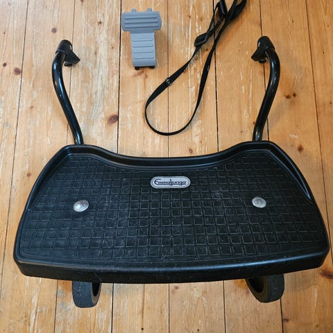 Använd ståbräda emmaljunga, passar till flera vagnar, 20kg. Nedslitna hjul, men rullar nog ett tag till