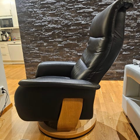 Svart recliner fåtölj i konstskinn säljes. Mycket gott skick, endast provad. Elektrisk fåtölj med steglösa positioner.