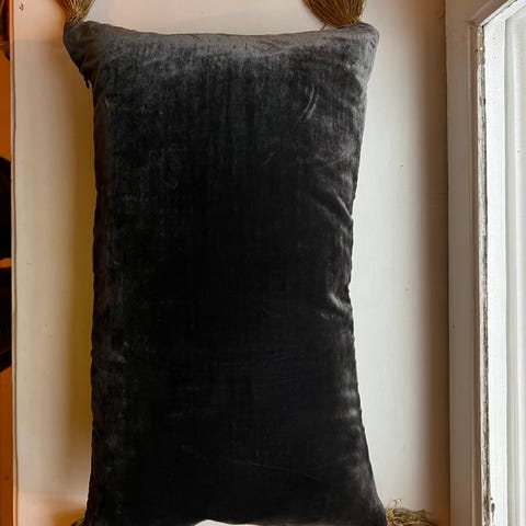 Beige kuddfodral tillverkad i sammet samt innerkudde i äkta dun. Kvadratisk form och mjuk textur, lämplig för användning som prydnadskudde i hemmet. Nypris 1200 totalt.