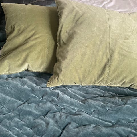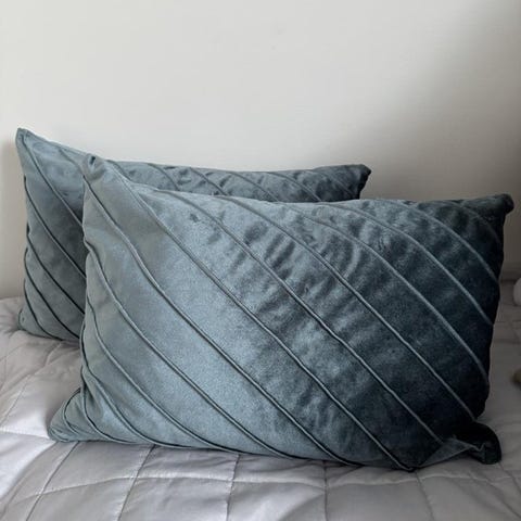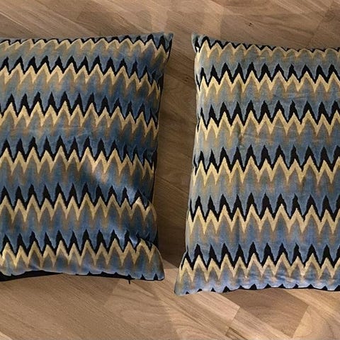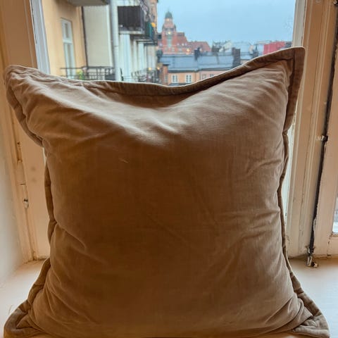 Kuddfodral i svart sammet med dekorativa guldtofsar i hörnen. Rektangulär form och mjuk textur. Innekudde i äkta dun ingår.