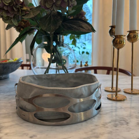 Stelton brödkorg med tygfoder. Korgen har en metallram med ovalformade utskärningar och ett avtagbart tygfoder i grått. Används för att förvara och servera bröd. 650kr nypris !
