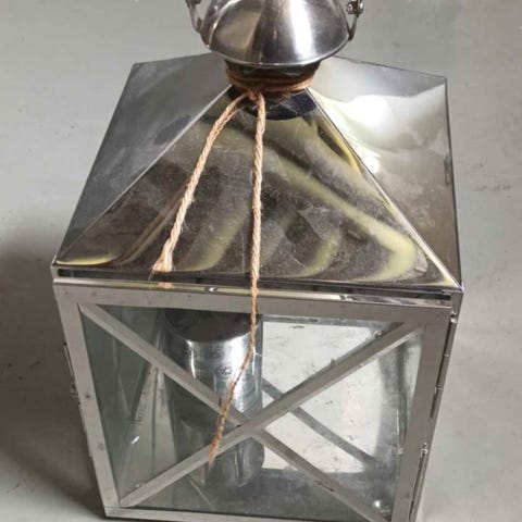 Lykta vit. Dekorationslykta i trä, glas och metall. Fyrkantig form med handtag för bärbar användning. Lyktan är nästan 35 cm hög. Den är Avsedd för inomhus eller utomhus. Den är i gott använt skick. Skicka bara meddelande ifall ni undrar något mer