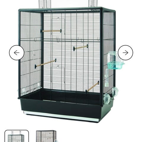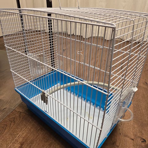 Transportbur för fåglar eller smådjur med stomme i plast och galler i metall.