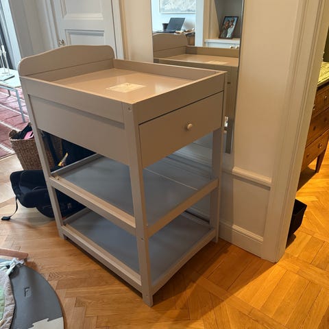 Skötbord från Nofred med en elegant, dansk design med två rymliga lådor för olika förvaringsmöjligheter. Det har rundade kanter för säkerhet.