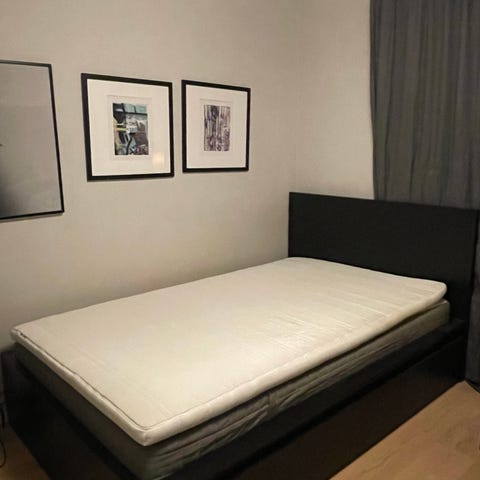 IKEA Sultan Songli madrass med måtten 210x90 cm, tillverkad med träram. Kompletterad med en Tromsdalen bäddmadrass i ljus färg. Passar som sängmadrass för enkelbäddar.