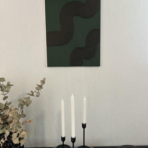 Tavlan är rektangulär och målad med akrylfärg på kanvasduk.