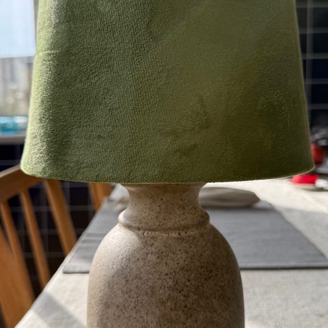 Bordslampa med rundad bas och beige lampskärm. Basen har en dekorativ design med bladmönster i mörkare nyanser. Lampan är lämplig för användning i vardagsrum eller sovrum som en dekorativ ljuskälla.