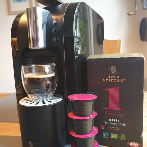 Arvid Nordquist OneCup kaffemaskin med kapselsystem för espresso och kaffe. Maskinen är svart och har en kompakt design. Används med Arvid Nordquist kapslar för enkel bryggning av kaffe och espresso.
