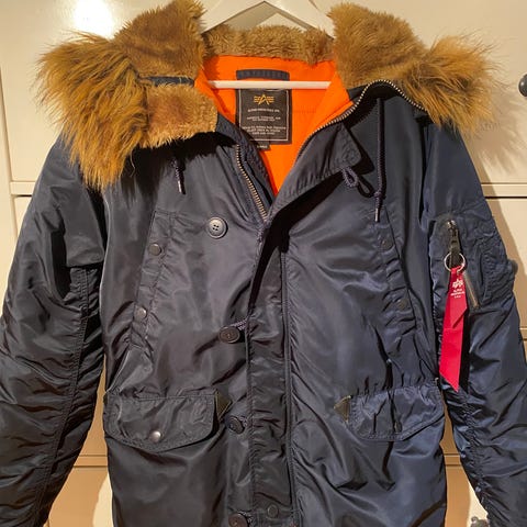 Brun vinterjacka för herr i storlek S. Jackan är vadderad och har huva, lämplig för kalla väderförhållanden.