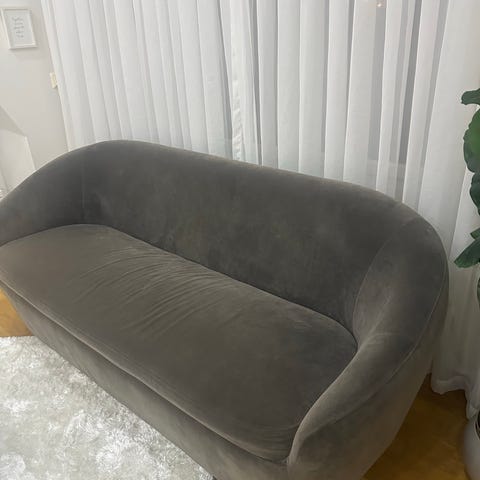 Trendig 3-sits soffa med rundade former med klädsel i blå sammet. Köpt från Ellos Home hösten 2022.