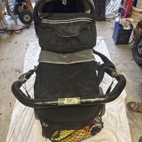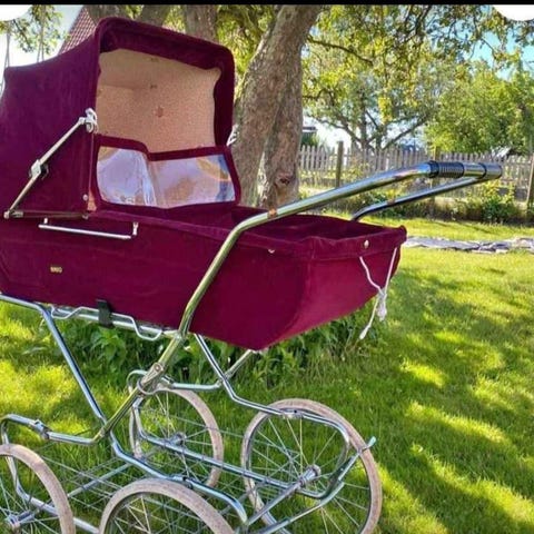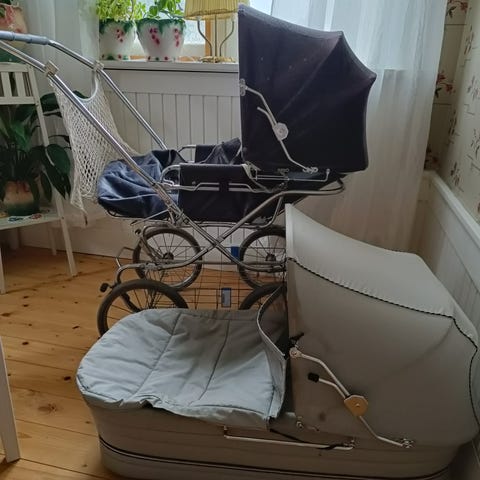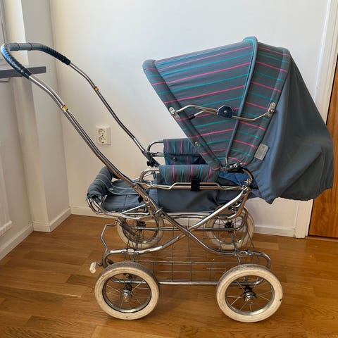 BRIO barnvagn vintage modell med grå botten och röda och blå ränder. Utrustad med stora hjul och en rymlig liggdel. Litet hål finns på insidan av sufletten, men bruksskicket är bra. Finns överdel till liggdelen helt men lite fläckigt.