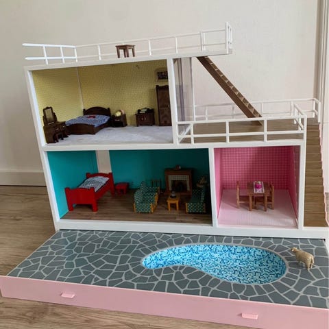 Dockhus i tre plan från Lundby som inte längre går att köpa. Det går dock att köpa till belysning och inredning.