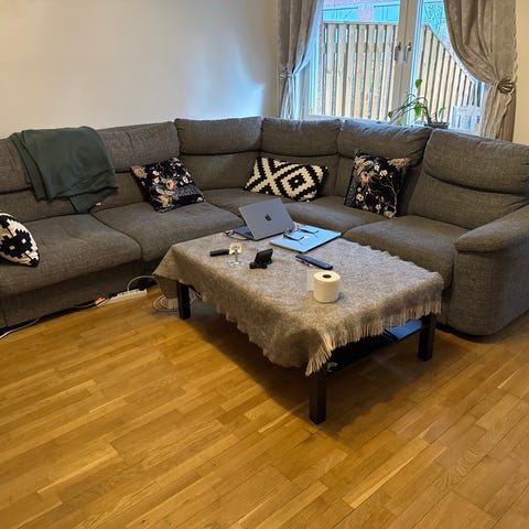 Soffan kan användas i hörnkonfiguration och fällas ut till en bäddyta. Den blir då 120*200cm.