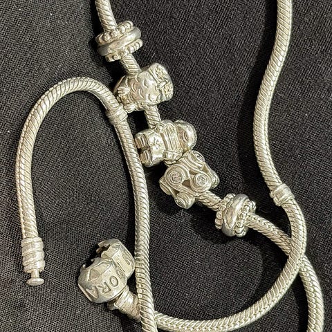Pandora halsband och örhängen i silver för kvinna. Smyckena har hjärtformade detaljer och är tillverkade i silv