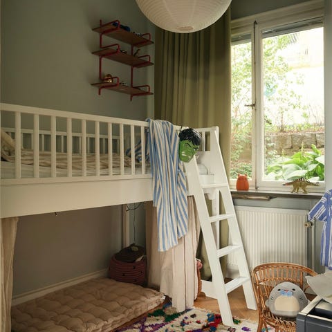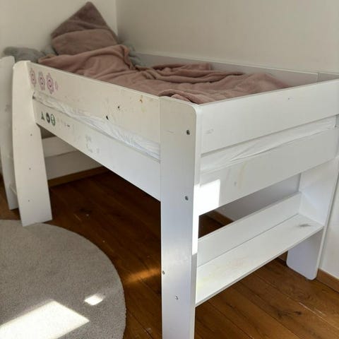 Fin platsbyggd loftsäng som är infäst i tak och vägg. Stege samt madrass medföljer. Monteras ned av köpare.