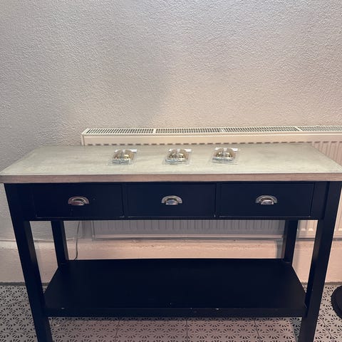 Fint vitt sideboard från Mio med 3st lådor och en grå toppskiva i cementliknande material.