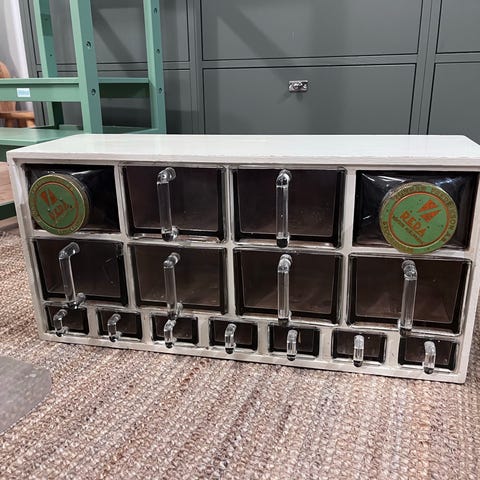 Fin Reda typ hylla med glas-skeppor. Trähyllan är renoverad med ny färg och nytt bakstycke. Saknar 3 av de mellanstora burkarna men de går att hitta på t.e.x. Tradera eller här på Blocket. Har även de små med skruvlock(sista bilden) om man hellre vill ha sådana istället för de små vanliga skepporna. BxHxD 80x23x19