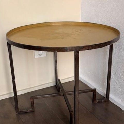 Rejält och stabilt soffbord i metall med härlig lack. Patina med karaktär. Hemleverans kan ordnas inom länet mot förskottsbetalning och 40kr milersättning.