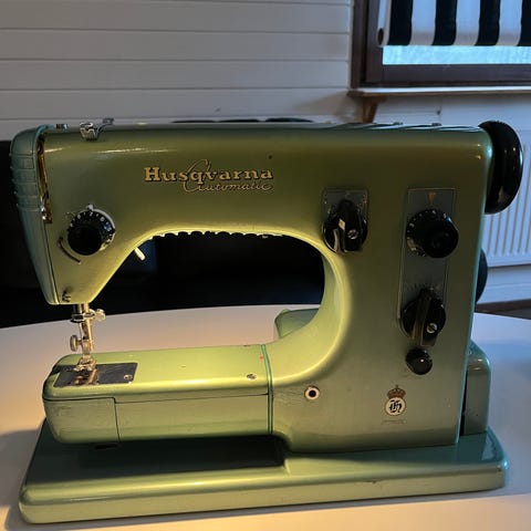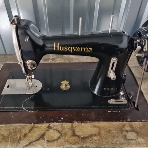 Gammal Husqvarna symaskin med elektrisk anslutning samt belysning. Maskinen är monterad på en träbas och levereras med ett brunt träfodral med handtag för förvaring och transport.