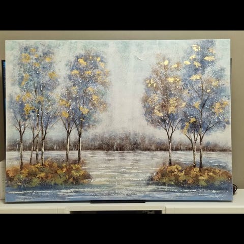 Säljer en stor och dekorativ målning i imponerande format 120×80 cm. Motivet föreställer ett vackert fjällandskap med en sjö i mitten och en liten räv i förgrunden. Tavlan är målad i struktur- och impastoteknik, vilket skapar ett djup och en tredimensionell känsla i färgen.