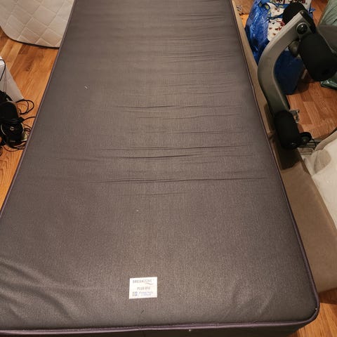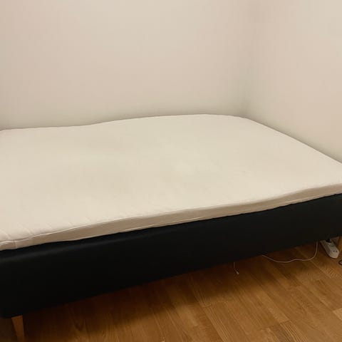 Sängen är inköpt 2019 och är i gott skick. Överdraget till resårmadrassen är nyligen kemtvättat. Det finns en mindre fläck på madrassöverdraget (se bild), men i övrigt är sängen väl omhändertagen. Basen är i mycket bra skick och har inga skador, synliga fläckar eller slitage. Kvitto finns.