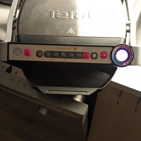 Den är utrustad med en sensor som automatiskt läser av tjockleken på köttet och justerar automatiskt tid och temperatur därefter. Indikatorn anger köttets tillagningsgrad, från rare till well done. Nio automatiska program för att grilla hamburgare, fågel, panini, korv, nötkött, fisk, skaldjur, fläsk och bacon. Manuellt läge med fyra temperaturinställningar för att grilla grönsaker och frukt. 800 cm² grillyta, passar för 6-8 personer. Indikatorn visar när grillen är klar att användas. Löstagbara grillplattor med non-stick beläggning som tål maskindisk.