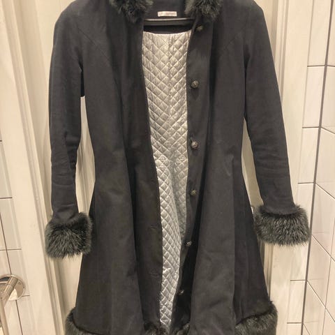Säljer en vändbar kappa Vanja Brunzell, står stl S.. helt svart bomullstyg invändigt, ullbaserat tyg utvändigt enligt bild . Mycket stor i storleken. I fint skick men finns spår av användning. Prutat o klart.