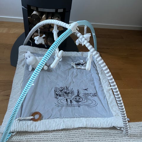 Mumin babygym med mjuk matta i grått och randiga bågar. Inkluderar 4 hängande mjukisdjur och spegel. Designad för spädbarn och småbarns lek och stimulans.