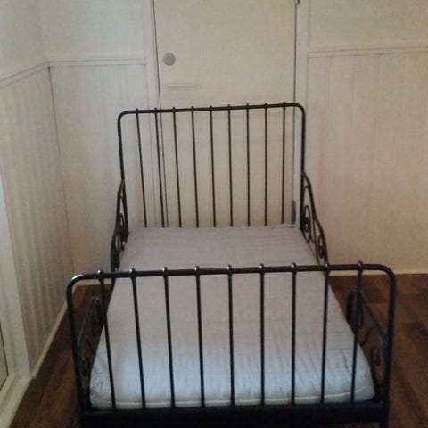 Sängen kan sjusteras att bli 130/165/200cm och 80cm bred. Huvudändan är 77cm hög och fotändan 67cm. Sängen kan tas isär i två delar och har ribbbotten. Den vita sidobrädan ingår ej.