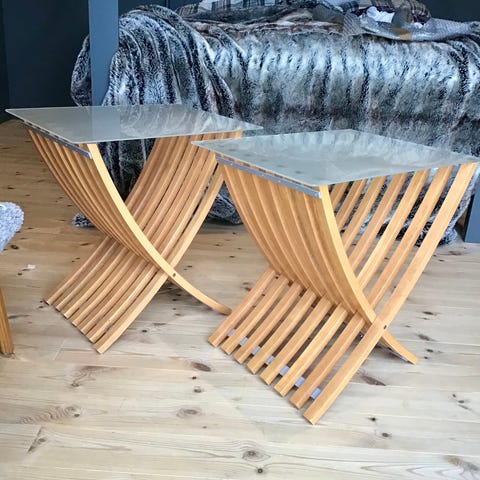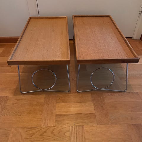 Två mindre bord att använda som sängbord eller sideboard. Repor som syns i visst ljus finns. Diameter 45 cm och höjd 43 cm.
