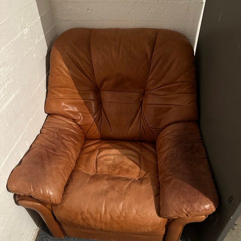 Fantastisk skön comfort och fin skinnklädsel, något sliten på armstöden, annars jättefin.