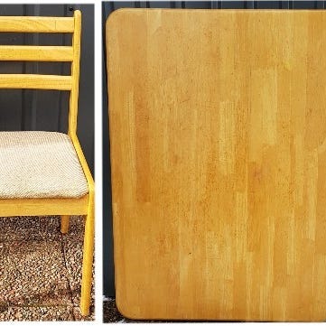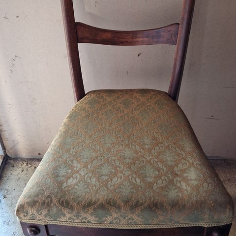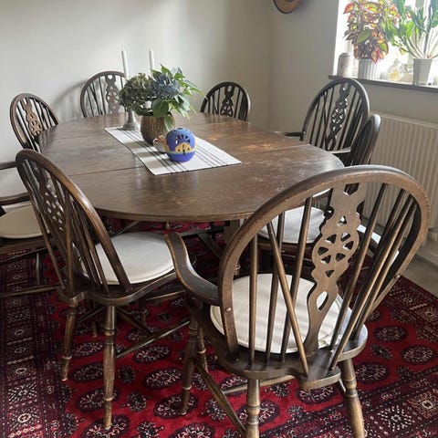 Vackert, äldre möblemang, nätt o lättplacerat. Bord, åttakantigt , 100 cm i diameter, 73 cm högt, samt 4 stolar. Stolarna klädda i handmålat tyg !