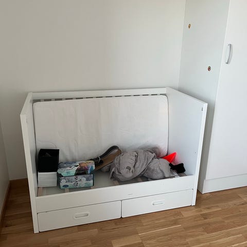 Madrass i bra skick med tvättbart madrassskydd och vitt spjälskydd.