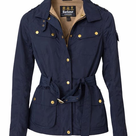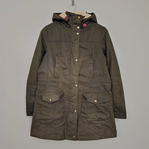 Barbour Trenchcoat i storlek M, vändbar så man kan få Barbour rutorna utvändigt och är tillverkad i polyester. Den har knäppning framtill och ett bälte i midjan för justering.