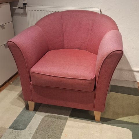 Mycket bekväm, tung och stabil fåtölj. Som synes i behov av att kläs om och putsas upp lite. Kommer bli otroligt fin med lite kärlek och i rätt inredningsstil.