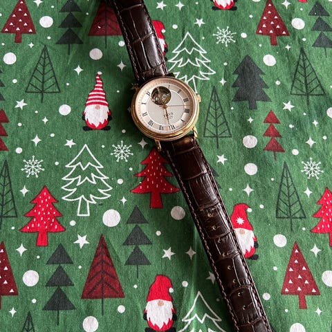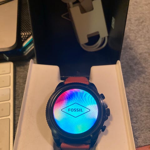 Fossil klocka för kvinna med metallarmband i guldton. Urtavlan har ett mönstrat motiv i matchande färg. Klockan har en klassisk rund form och är avsedd för dam.