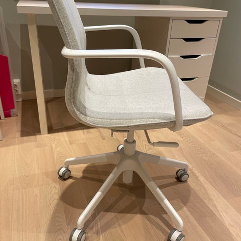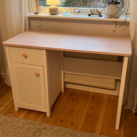 Säljer ett fint skrivbord med två förvaringsenheter (hurtsar) med lådor och en skrivbordsstolar med hjul. Skrivbordsskiva i träfärg och vita lådor. Spegel lampa (smink lampa). Passar för ungdomsrummet eller hemmakontor. Säljer helst allt i ett paket, men säljer också separat.