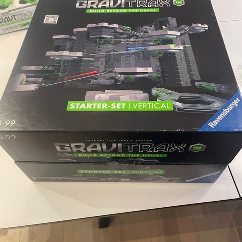 Gravitrax barnleksak med olika färgglada plastdelar och tillbehör för att bygga banor. Leksaken innehåller flera komponenter i plast och är avsedd för barn.