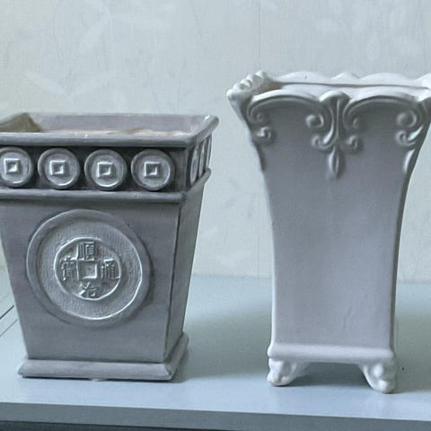 Upsala-Ekeby ytterkruka modell Karlskrona, vintage. Höjd 11 cm, diameter upptill 13 cm. Lite skavt i gulddekoren på "sidohandtagen", lite missfärgning på insidan i ena krukan för övrigt i fint skick, inga skador eller krackeleringar. 2 stycken finns, pris för en 125 kr, båda för 200 kr. Hämtas, skickas ej.